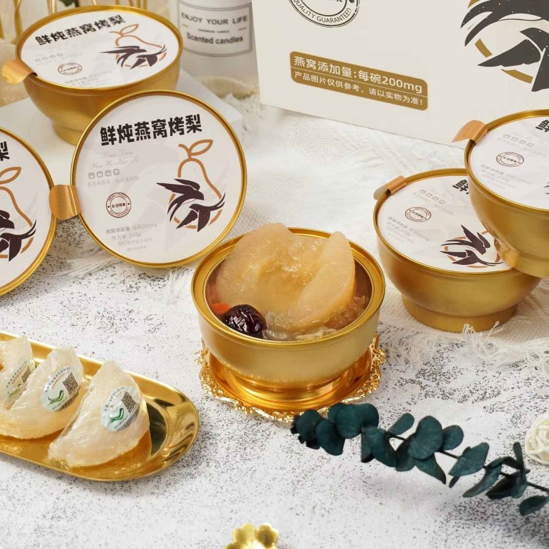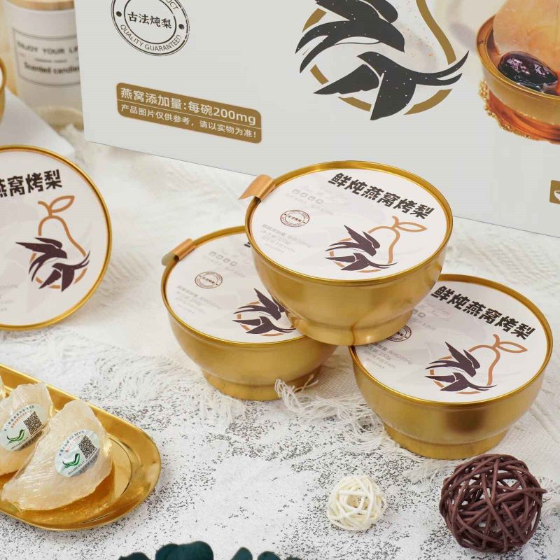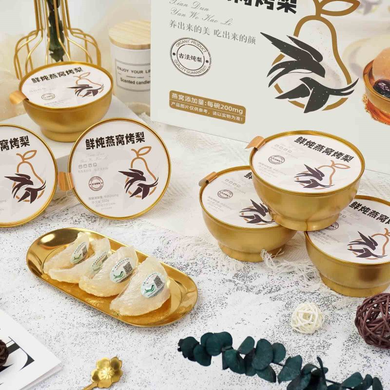 Estamos orgullosos de presentar el Nido de Pájaro Fresco Guisado con Peras Asadas, una caja de regalo única y deliciosa. El nido de pájaro fresco se cuece cuidadosamente y se mezcla hábilmente con las glutinosas peras asadas con caramelo, brindándole un doble festín de textura y sabor. Y el exquisito empaque muestra un gusto elegante. Es una excelente opción para regalar o disfrutarlo tú mismo, añadiendo belleza a cada momento.