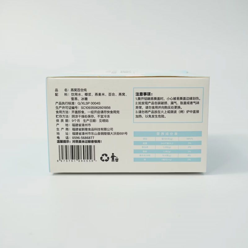 Ingrediente: Agua potable, leche de coco, avena, azucena, nido de pájaro, golondrina, azúcar de roca